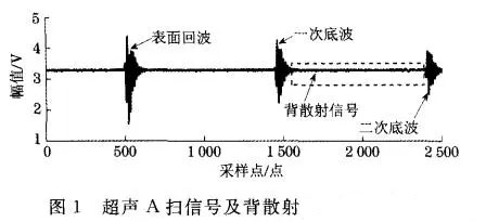 在不同固溶溫度(900~1150 ℃)下對GH4169試樣進行固溶處理。采用脈沖回波法對試樣進行縱波超聲檢測,探頭頻率為10 MHz,用一次底波、二次底波的峰值、時間差和試樣厚度計算衰減系數(shù)、聲速,對截取的背散射信號(截取位置為一次底波和二次底波之間,如圖1所示)進行經(jīng)驗?zāi)B(tài)分解,取分解后生成的固有模態(tài)函數(shù),計算平均功率w;和波形維數(shù)FsHA,計算公式如式(1)所示。