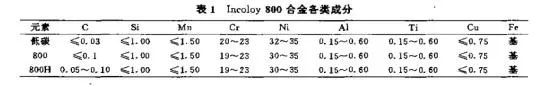 ncoloy 800合金屬于鐵—鎳一鉻合金,具有良好的耐腐蝕性能和抗氧化性能,在常溫和高溫下都有高的抗張強(qiáng)度和高的蠕變破斷強(qiáng)度。廣泛應(yīng)用于鍋爐設(shè)備、水蒸汽高塔設(shè)備的壓氣管和合成氨輸出壓力管以及家庭炊具等。已發(fā)展成為一個(gè)系列Incoloy 800合金,主要分類由表1給出。