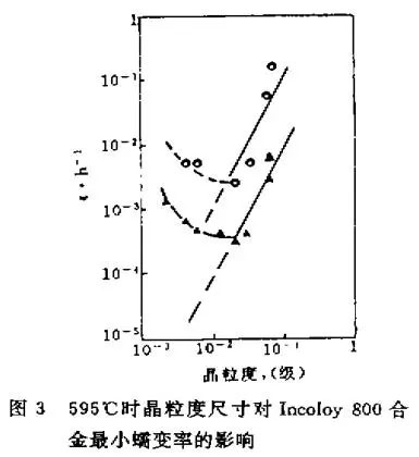 Incoloy 800合金高溫蠕變(持久性能)是主要的性能指標(biāo),要求33MPa應(yīng)力下斷裂時(shí)間超過1000h。在許多情況下粗晶粒材料比細(xì)晶粒材料的蠕變率低,而應(yīng)變一斷裂強(qiáng)度則高。一個(gè)簡(jiǎn)單化的解釋就是,與細(xì)晶粒材料相比,粗晶粒材料可供晶界滑動(dòng)的晶界總面積較小。在若干種合金中都已觀察到了產(chǎn)生最大蠕變抗力的最佳晶粒度(如圖3所示),晶粒的大小如果超出此臨界值,穩(wěn)態(tài)蠕變率就會(huì)上升。美國(guó)標(biāo)準(zhǔn)ASTM對(duì)Incoloy800H合金要求晶粒度2~5級(jí),晶粒直徑為(1.8×10-²cm~0.62×10-²cm)正處于最佳晶粒度,保證最小蠕變率。